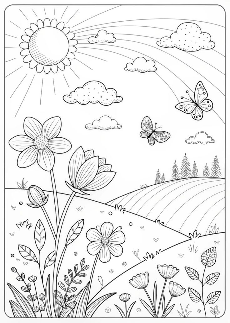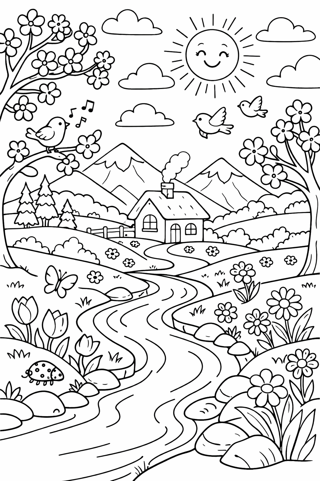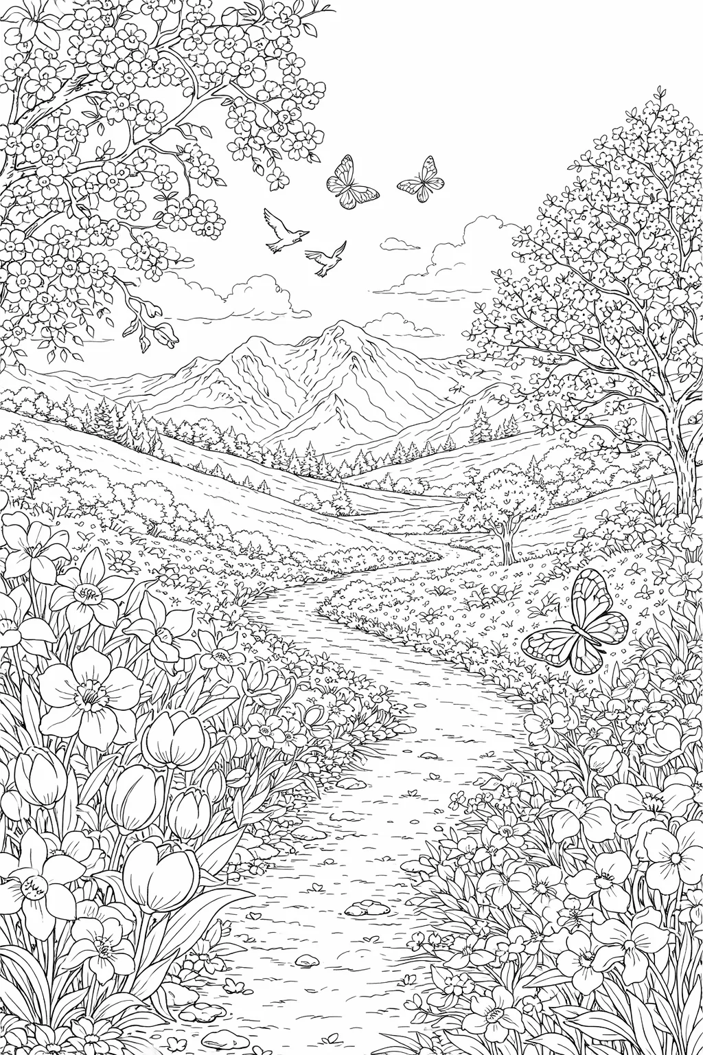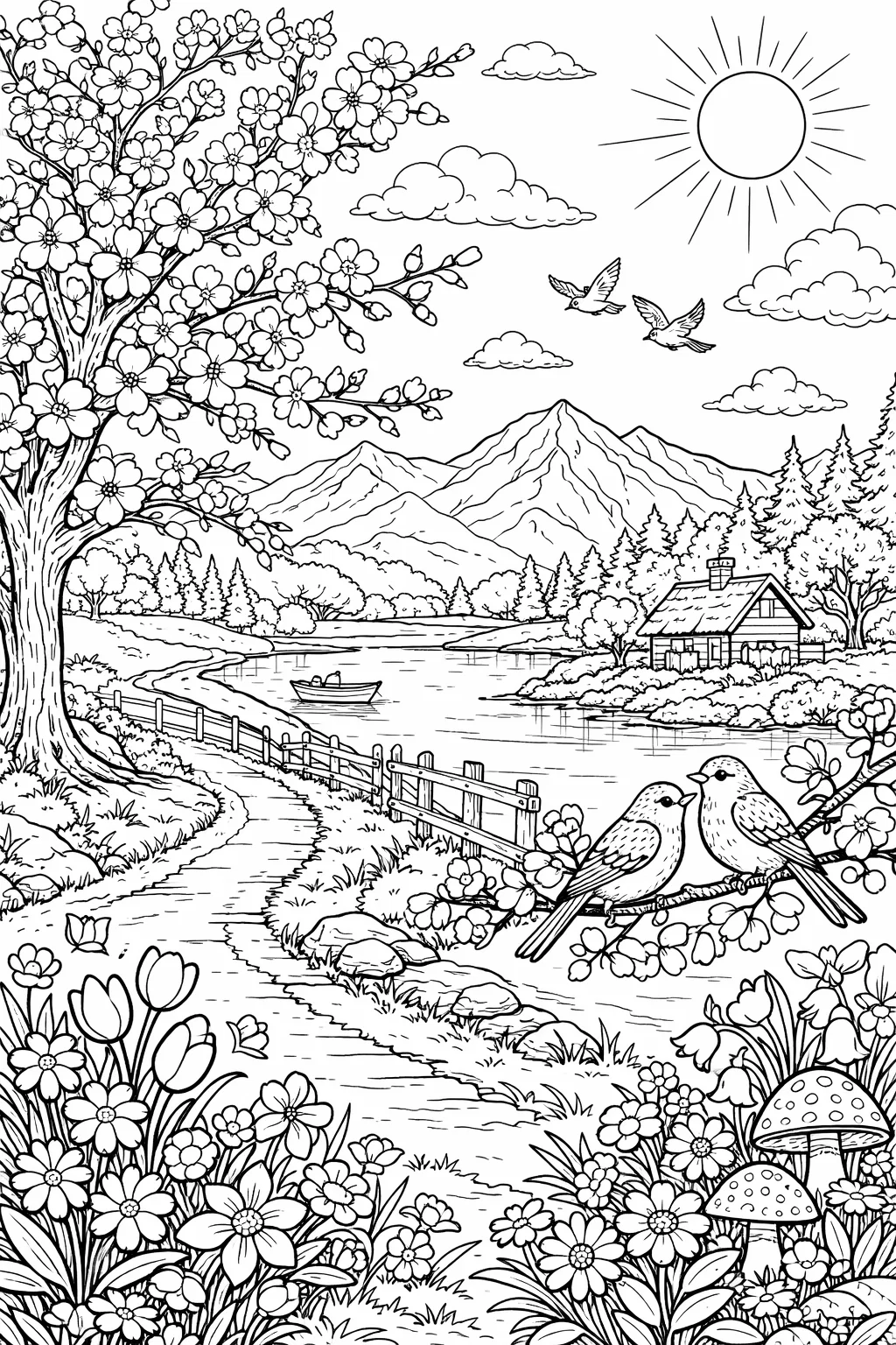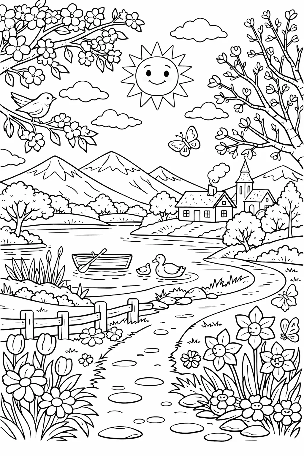 Primăvara este anotimpul renașterii naturii, când apar primele flori, copacii înmuguresc, iar peisajele devin pline de viață. În această colecție vei găsi peisaje de primăvară de colorat cu imagini alb-negru și contur clar, perfecte de imprimat sau de printat gratis. Toate planșele pot fi descarcă gratuit în format PDF, optimizate pentru format A4, astfel încât să le poți imprima ușor acasă.